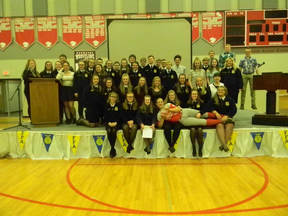 Read MoreThursday, April 26, 2018, the Norwayne FFA Chapter held its 65th annual FFA Banquet. Many of our FFA members had received awards for various CDEs (Career Development Events) such as: Soil Judging, Parliamentary Procedure, Food Science, Job Interview, Public Speaking, Ag Sales, Livestock Judging, Equine Judging, Dairy Cattle Judging, Meat Judging and Agriscience Fair. A few of our members had received star awards for each of their grades. This year’s Honorary Members were Brian and Robin Croft and WG Dairy. We recognized the State and American Degree recipients as well as the officers who had gotten gold ratings on their books and proficiency awards. The new officer team was announced as well, and the Student Advisor is Kendra Marty, Sentinel is Michael Garrison, Reporter is Ellyssa Simmons, Treasurer is Annie Boss, Secretary is Carlie Schlatter, Vice President is Kendra Keener and President is Emily Croft. Thank you to all who came and supported our FFA Chapter.