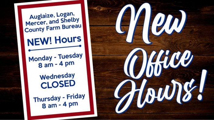 Auglaize, Logan, Mercer, and Shelby County Farm Bureau NEW! Office Hours Monday – Tuesday 8 a.m. – 4 p.m. Wednesday…
