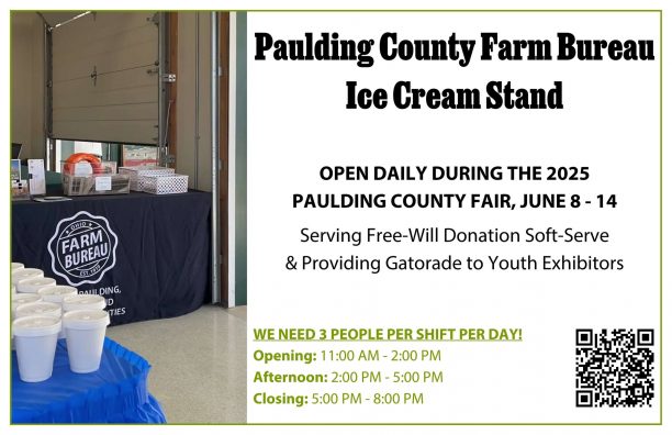 Is it time to renew your membership? Would you like to become a member? Work a shift in the Farm Bureau Building during the 2025 Paulding County Fair and receive a $75 annual membership (15% savings)!