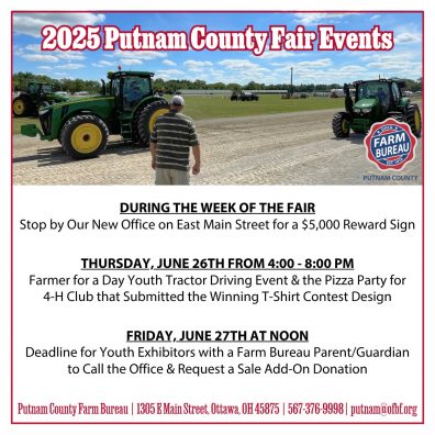 Read MoreThe Putnam County Fair takes place June 23-28, 2025. During the week of the fair, stop by the county Farm Bureau office for a popsicle, bottle of water, and a $5,000 Property Protection Reward sign. The office address is 1305 East Main Street Ottawa, OH 45875