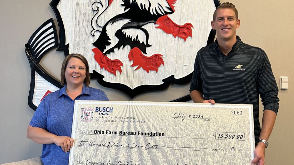 Heidelberg Distributing Company once again had a summer Busch Light promotional campaign in Champaign, Clark, Fayette, Greene, Madison, Miami and Montgomery counties, benefiting the Ohio Farm Bureau Foundation. Matt Pohlman, general marketing manager, presented Ohio Farm Bureau Foundation Executive Director Kelly Burns with a $10,000 donation from this year’s campaign.