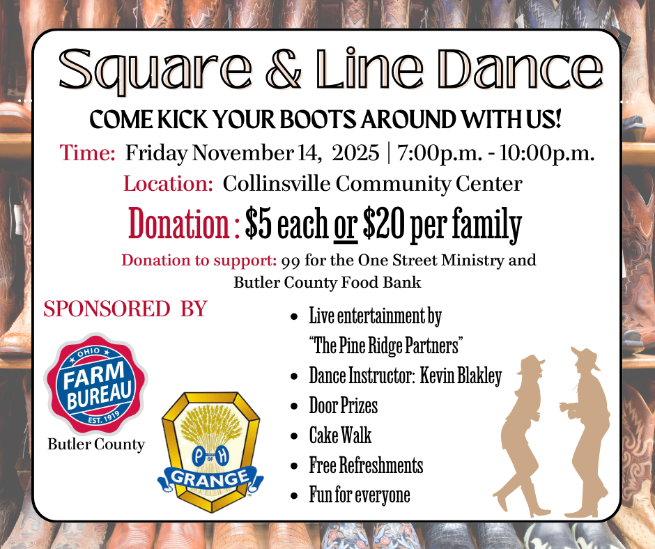 Butler County Dance Nov. 14Put on your boots and join us for an evening of dancing, live music, and community fun at the Collinsville Community Center!