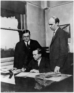 In the photo, you can see Lee Palmer, left, the first president of Farm Bureau Mutual, Murray Lincoln, right, Executive Secretary and future Nationwide CEO, and Ezra Anstaett, seated, the company’s first general agent. They are signing the first policy sold for what we know today as Nationwide.