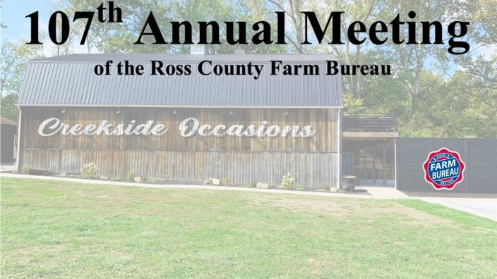 The Ross County Farm Bureau Board of Trustees invites you to attend Farm Bureau’s 107th Annual Meeting on Thursday, Aug. 21, 2025 at Creekside Occasions, 14847 St Rt 772, Chillicothe. Registration will begin at 6 p.m. and dinner at 6:30 p.m. Business meeting to follow. Members will be voting on policies, state annual meeting delegates, and board of trustee members.