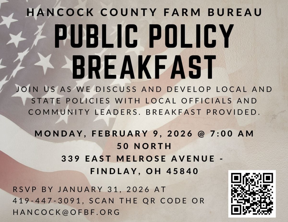 Event Hancock County Farm Bureau Public Policy Breakfast Feb 9, 2026 | 7:00 am - 9:00 am Add to Google Calendar Add to iCal or Outlook Posted on January 20, 2026 Date/Time Date(s) - February 9, 20267:00 am - 9:00 am Location Loading Map.... 50 North339 E Melrose Ave - FindlayEvents 41.0651713 -83.6425739 Categories Events Join us Feb. 9 as we discuss and develop local and state policies with local officials and community leaders. Register by Jan. 31. Hancock County Related Events Feb 9, 2026 | 7:00 am - 9:00 am Hancock County Farm Bureau Public Policy Breakfast View Event Mar 9, 2026 | 6:00 pm - 9:00 pm Hancock County Farm Bureau Annual Meeting plus Sweets & Spirits Social Hour View Event Paid Advertisement