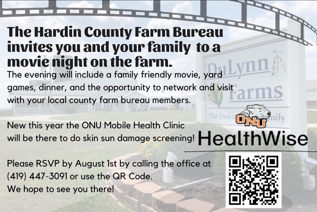 Event Hardin County Farm Bureau Movie Night Aug 8, 2025 | 6:00 pm - 10:00 pm Add to Google Calendar Add to iCal or Outlook Posted on June 11, 2025 Date/Time Date(s) - August 8, 20256:00 pm - 10:00 pm Location Loading Map.... DuLynn Farms9970 Twp Rd 120 - Kenton Events 40.660915 -83.690656 Categories Events Doors open at 6 p.m. and movie starts at 7:30 p.m. New this year: ONU Mobile Health Clinic will be there to do sun damage screening. RSVP by Aug. 1 for this FREE event by clicking this link. Hardin County Related Events Jan 21, 2026 | 6:00 pm - 9:00 pm Benefits Banquet Hosted By Hancock, Hardin, Seneca & Wyandot County Farm Bureaus View Event Paid Advertisement