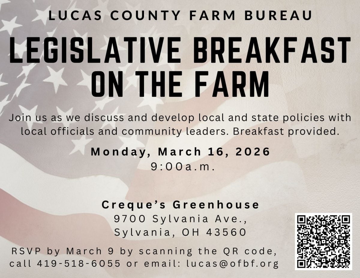 Event Lucas County Farm Bureau Legislative Breakfast On The Farm Mar 16, 2026 | 9:00 am - 10:00 am Add to Google Calendar Add to iCal or Outlook Posted on January 27, 2026 Date/Time Date(s) - March 16, 20269:00 am - 10:00 am Location Loading Map.... Creque Farms9700 Sylvania Ave. - SylvaniaEvents 41.688376 -83.77601 Categories Advocacy Events Join us as we discuss and develop local and state policies with local official and community leaders. Breakfast provided. RSVP by March 9 by calling the office at 419-518-6055 or via link. Lucas County Paid Advertisement