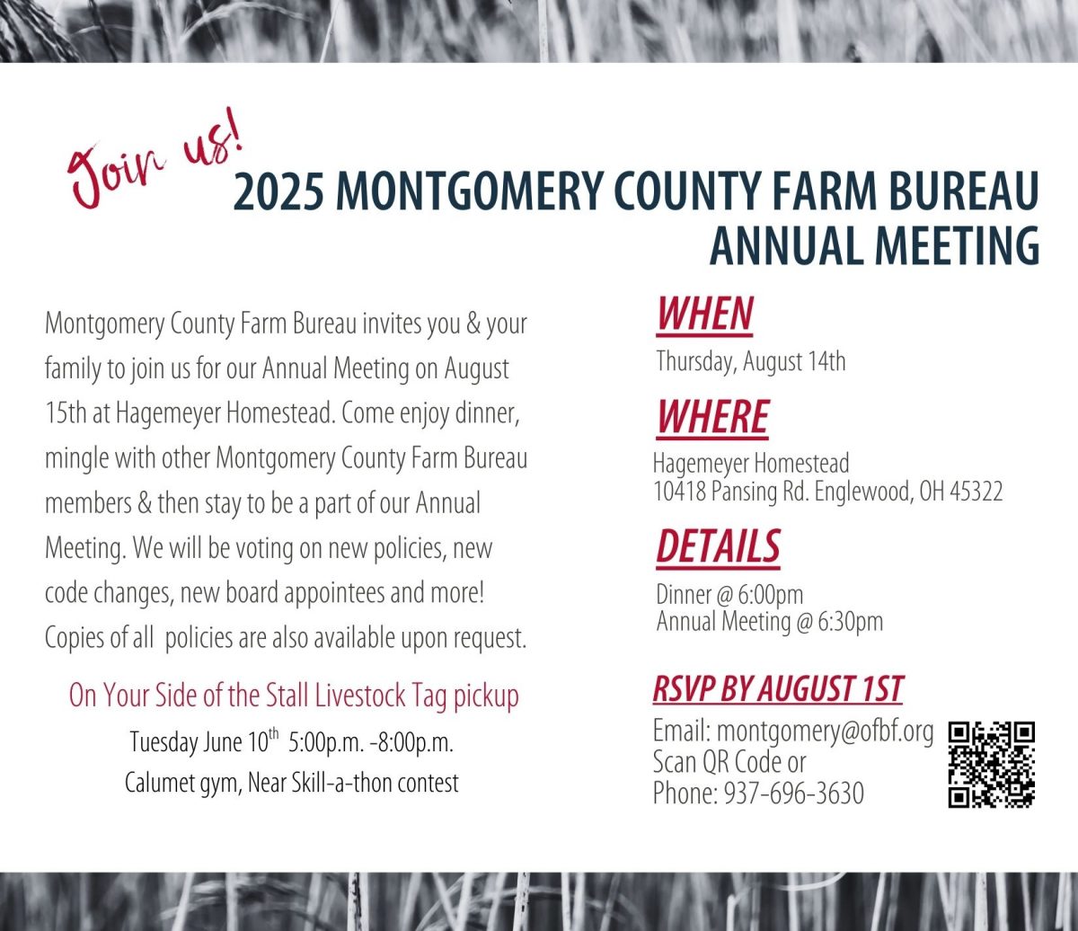 Montgomery County Farm Bureau invites you and your family to join us for our Annual Meeting Aug.15 at Hagemeyer Homestead. Come enjoy dinner, mingle with other Montgomery County Farm Bureau members and then stay to be a part of our Annual Meeting. We will be voting on new policies, new code changes, new board appointees and more! Copies of all policies are also available upon request.