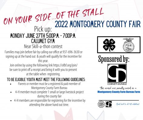 Come pick up your stall signs to earn your 2022 incentive. This is a program for Farm Bureaumembers with children showing at the Montgomery County Fair. Pick up the signs June 27 from 5 p.m. to 7 p.m. If you are not currently a Farm Bureau member or know someone who is interested in joining, bring them along. You can sign up at the event with the county representative. If you are joining or renewing, cash ($75 membership) or check is accepted! Details for the event are below!