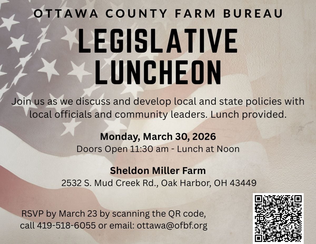 Event Ottawa County Farm Bureau Legislative Luncheon Mar 30, 2026 | 11:30 am - 1:30 pm Add to Google Calendar Add to iCal or Outlook Posted on January 27, 2026 Date/Time Date(s) - March 30, 202611:30 am - 1:30 pm Location Loading Map.... Sheldon Miller Farms2532 S. Mud Creek Rd. - Oak HarborEvents 41.478451 -83.110059 Categories Events Join us as we discuss and develop local and state policies with local officials and community leaders. Lunch will be provided. RSVP by calling the office at 419-518-6055 or via this link by March 23. Ottawa County Paid Advertisement