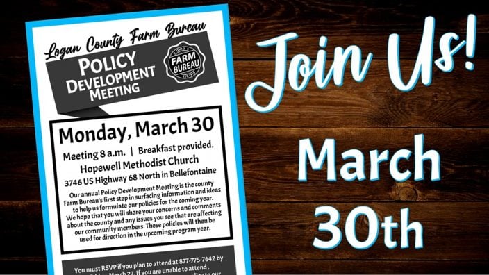 Our annual Policy Development Meeting is the county Farm Bureau’s first step in surfacing information and ideas to help us formulate our policies for the coming year. We hope that you will share your concerns and comments about the county and any issues you see that are affecting our community members. These policies will then be used for direction in the upcoming program year.