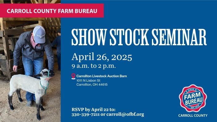 Carroll County Farm Bureau will hold a Show Stock Seminar April 26, 2025 at the Carrollton Livestock Auction Barn from 9 am to 2 pm. This event is free and open to any youth exhibitor planning to show hogs, steers, goats or sheep.