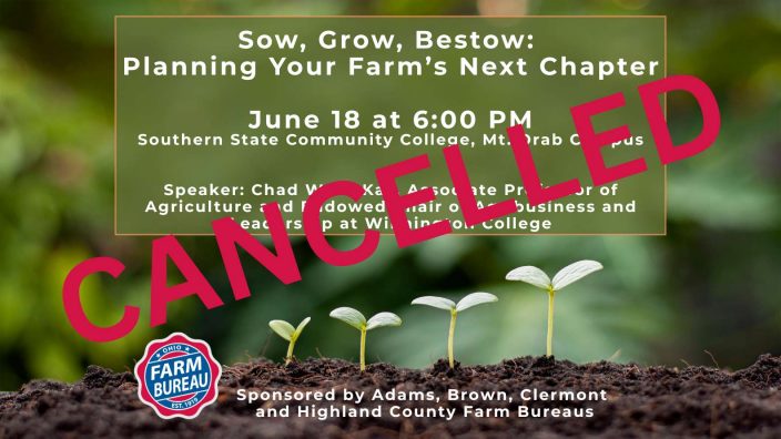 We regret to inform you that the Sow, Grow, Bestow: Planning Your Farm’s Next Chapter event scheduled for June 18 at Southern State Community College has been canceled due to low enrollment. We appreciate your interest and hope to offer similar opportunities in the future that better fit our members schedules and/or needs. Thank you for your continued support of the Farm Bureau!