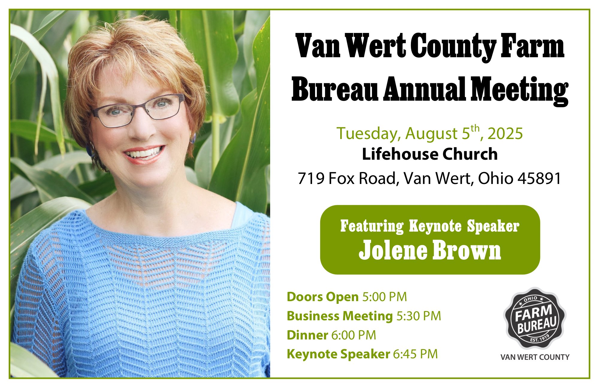 The annual meeting takes place Tuesday, Aug. 5 at Lifehouse Church in Van Wert, with special guest speaker Jolene Brown.